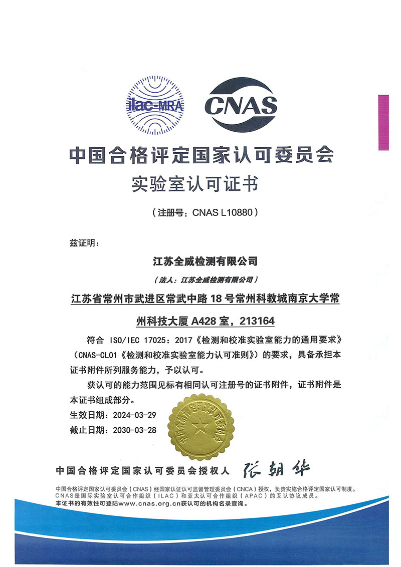 公司于2016年11月取得CMA資質(證書編號:161012050690),2018年03月取得CNAS資質(證書編號:CNAS L10880)。